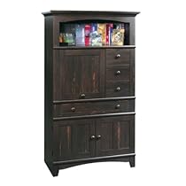 - Flip-up door conceals storage area for monitor. Full upper shelf.