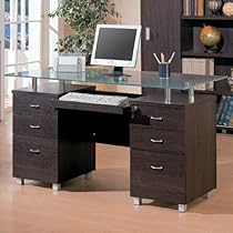 - The glass top desk features a keyboard tray tow locking drawers and two file drawers.